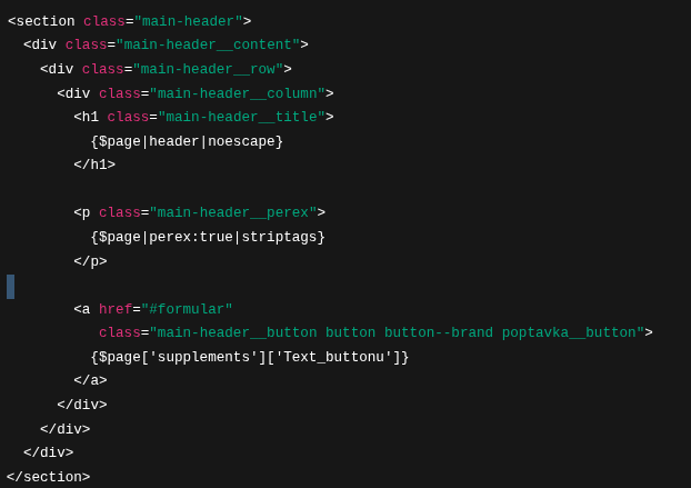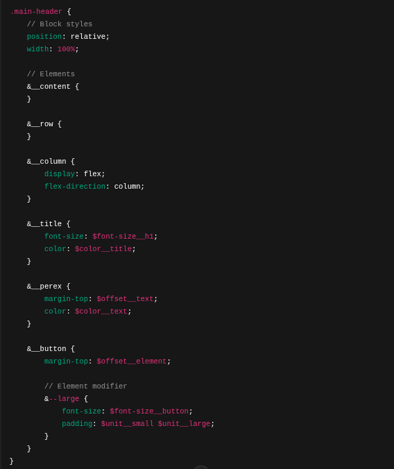 The following example demonstrates a correct implementation of the BEM (Block, Element, Modifier) methodology applied to a main header component.