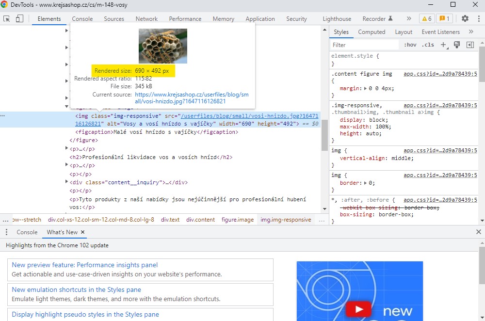 Jakmile najedete myší na adresu fotky (to za src=), zobrazí se vám informace o velikosti fotky. Větišnou vás zajímá pouze šířka obrázku (první hodnota). Tedy například na Krejsashopu potřebuji fotky, aby měly šírku 690 px. Pozor každý web/e-shop může mít obsah na blogu nebo v poradně různou šířku, proto je vždy vhodné dopředu zjistit šířku vkládání. .jpg?1655222138603)